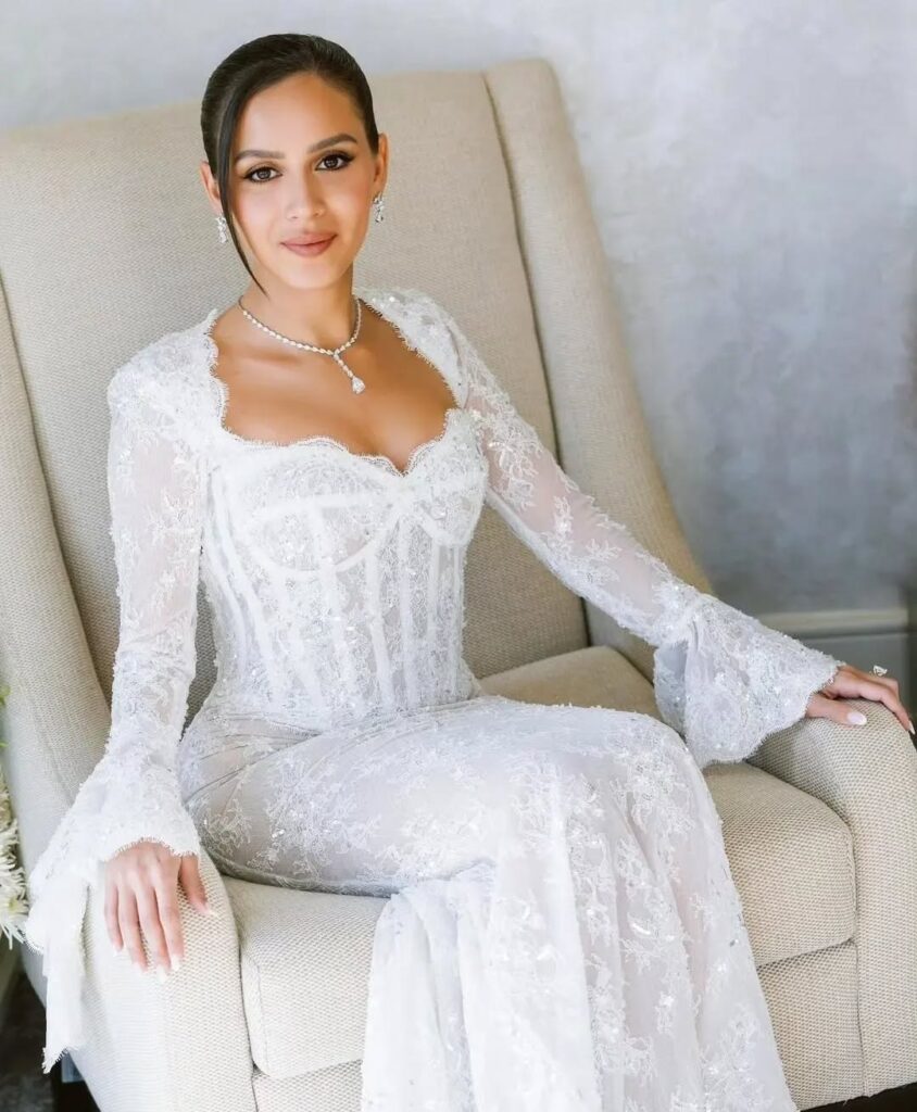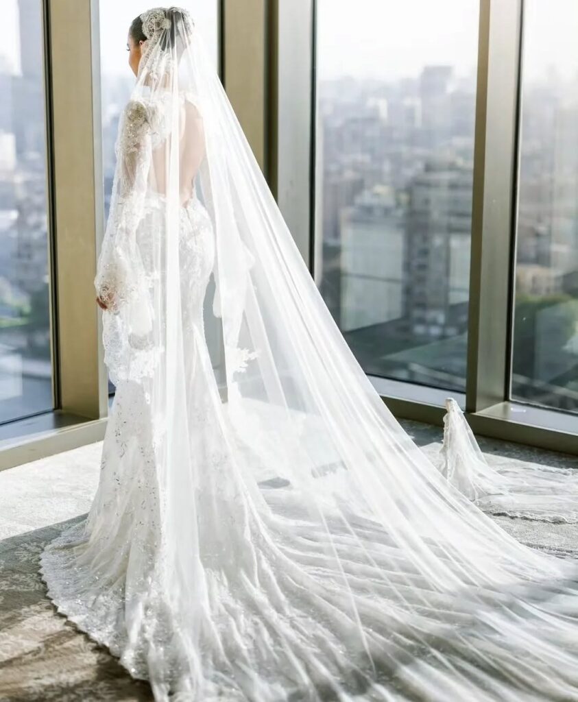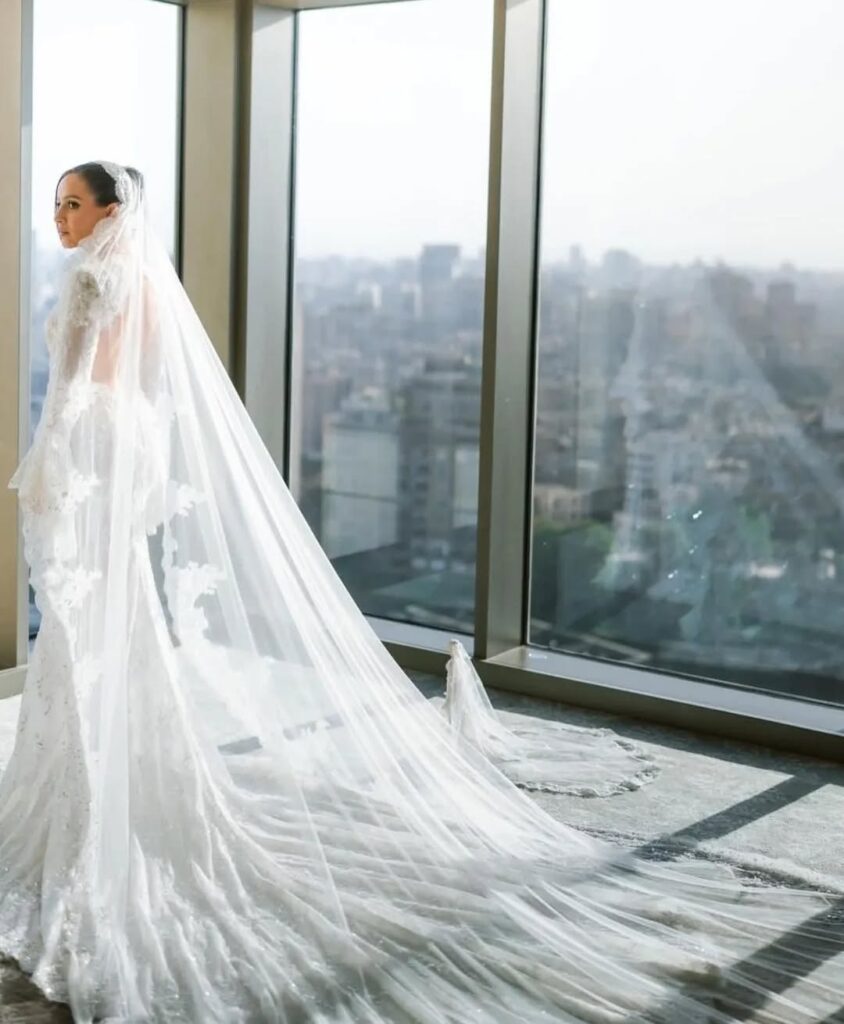 Egyptian actress Jamila Awad looked absolutely stunning on her big day, rocking a custom Rami Kadi Couture wedding dress. The gown, decorated with lace and crystal embroidery, was pure elegance, complete with a dreamy lace-bordered, crystallized veil.